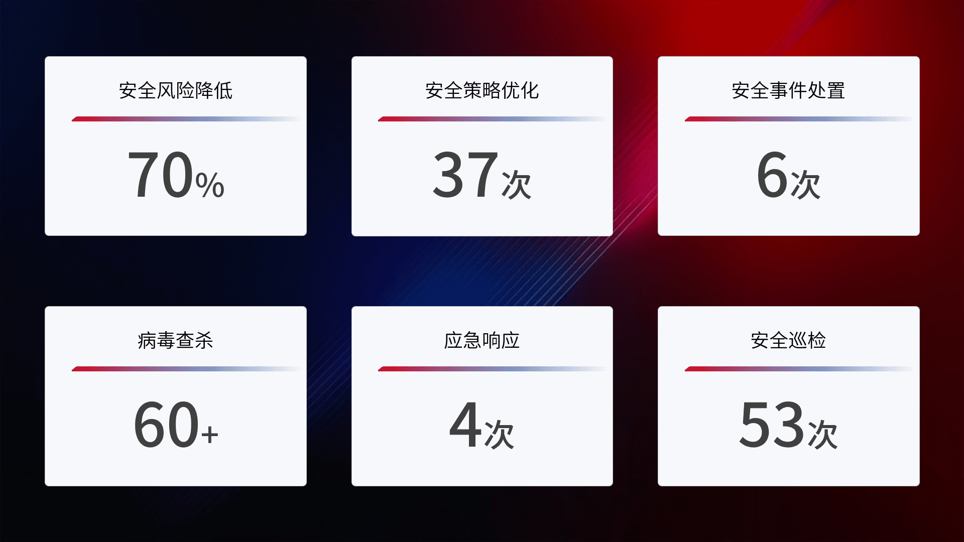 提供全面的安全事件报告体系,,,,包括处置报告、、周报、、、季度和年度总结,,结合持续监控,,,,帮助客户深入了解网络安全状况。。