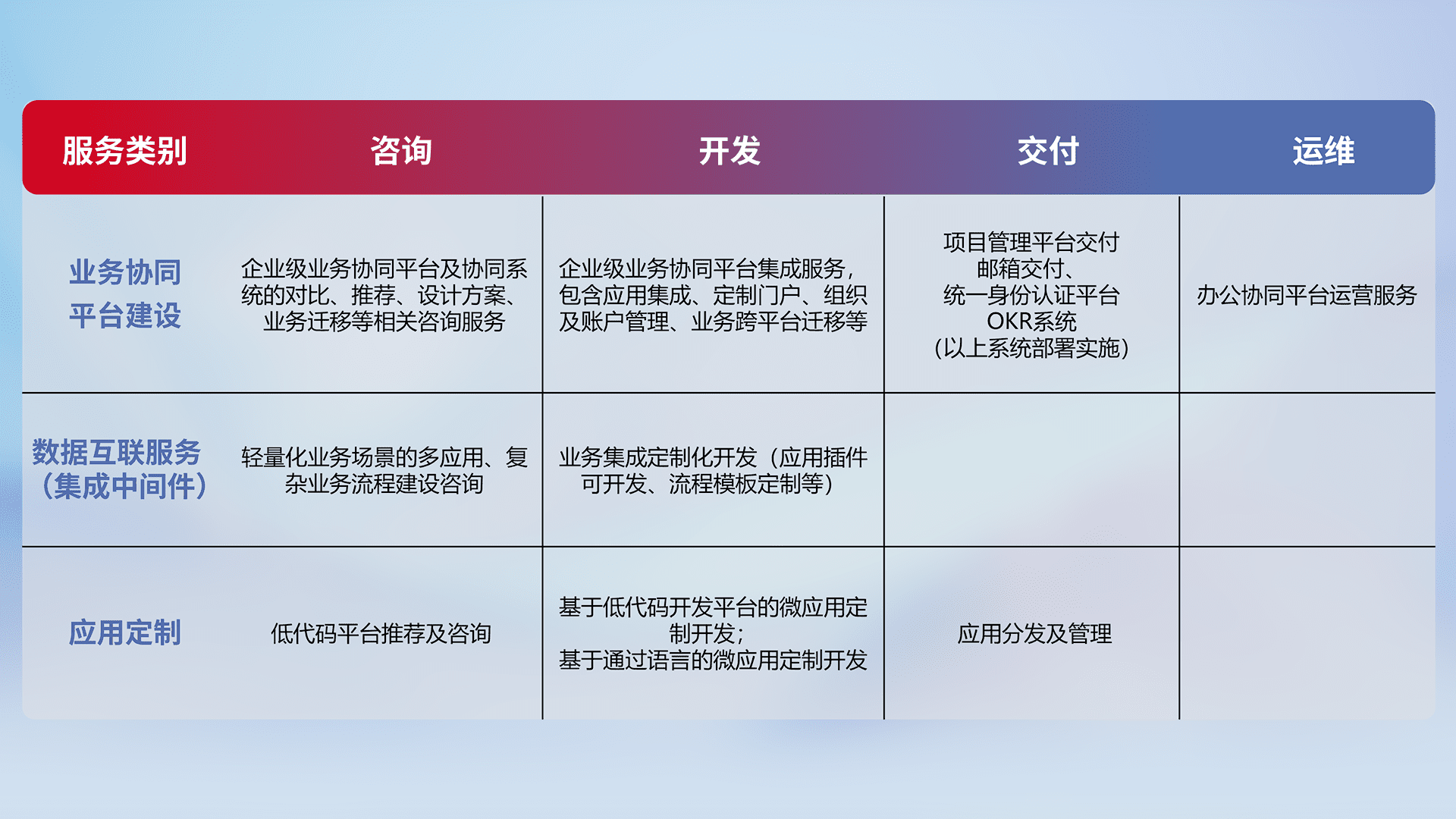 针对钉钉、、、企微、、、IDaas等平台级产品提供产品的规划、、、方案、、、交付、、、定制化开发等服务,,,实现如统一协同办公、、、智能客户服务、、、、混合会议管理、、、智能数据查询、、、、等业务场景,,实现数字化转型。。。